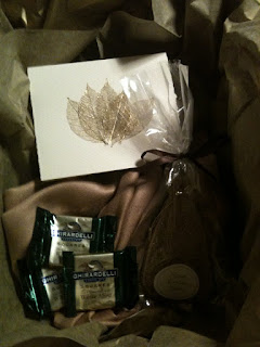 This was the final package. I wrapped it up in gold tissue paper and added a couple of chocolates to sweaten the deal. Unfortunately not all of the bridesmaids enjoyed the delicious Ghiradelli chocolate because of my lab...who has a thing for chocolate. (Thank goodness she wasn't sick!)